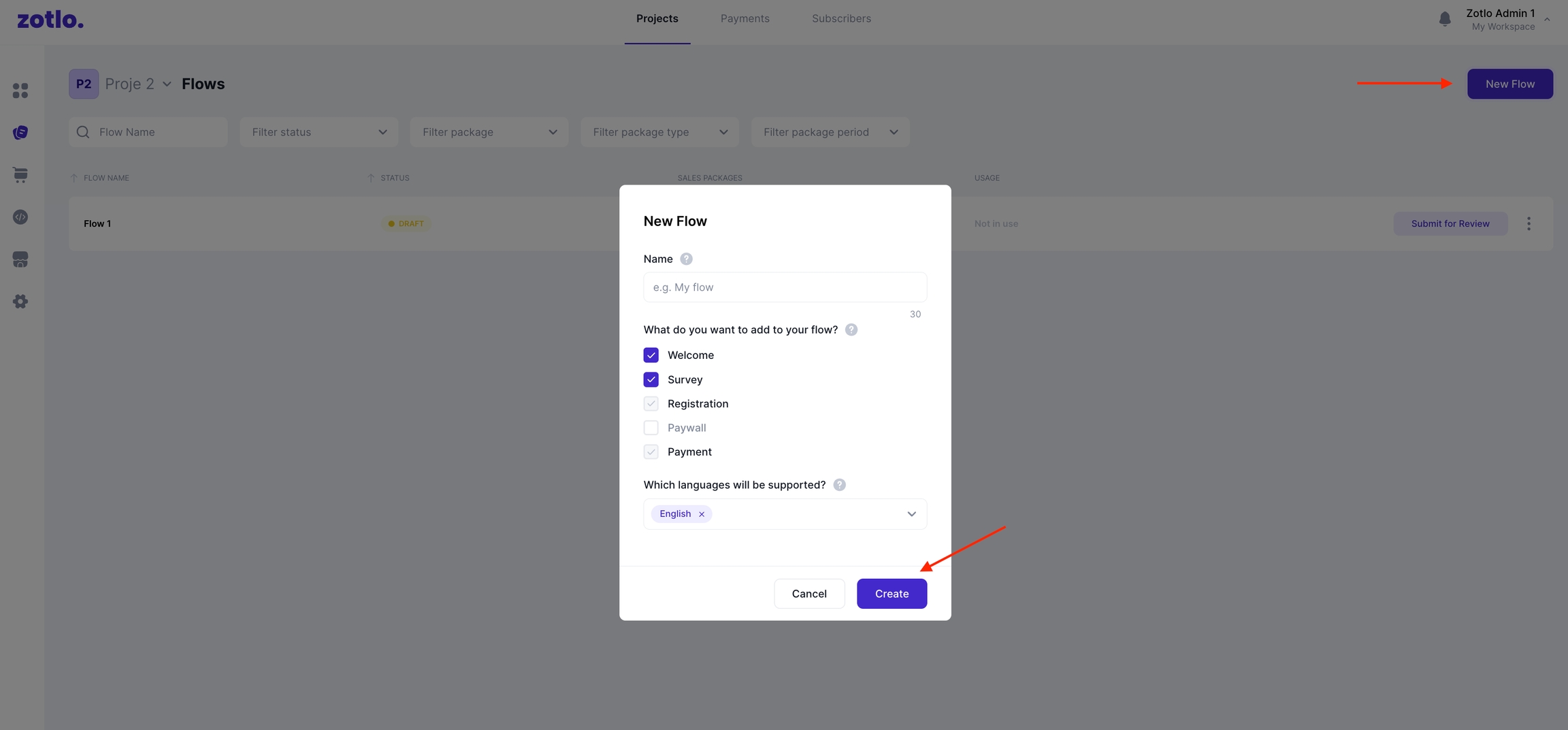 Zotlo'da bir akış (flow) oluşturmak için, projenizin içinde yer alan "Flows" sayfasına giriş yapın. Ardından "Yeni Akış" butonuna tıklayın. Yeni akışınıza ait bilgileri gireceğiniz ekran açıldıktan sonra, akış isminizi belirtin, kullanmak istediğiniz sayfaları seçin ve sitede desteklenecek dilleri girin.