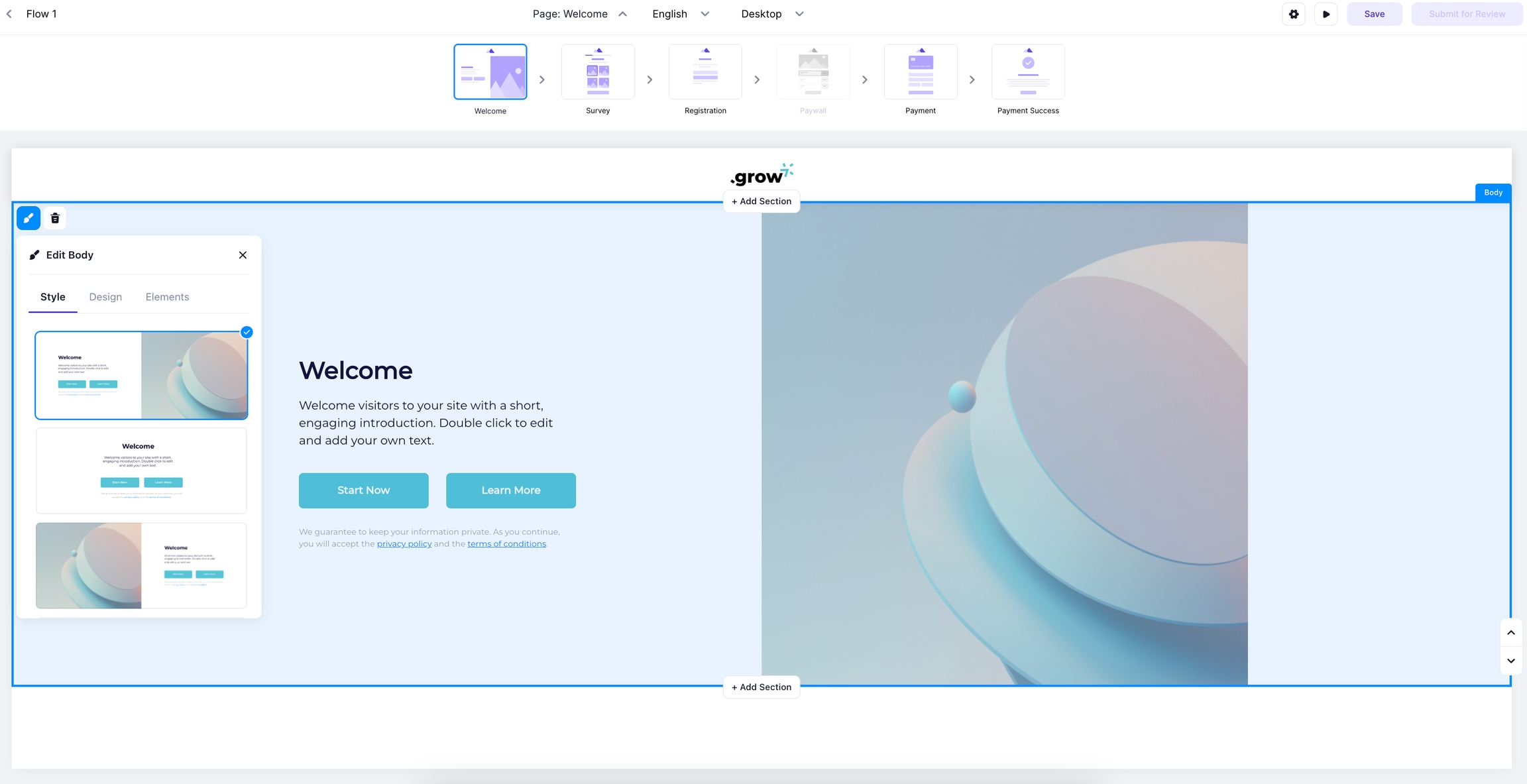 Karşılama sayfası, oluşturulan akışlarda kullanıcılara başlangıç bilgilerini sunmak, hoş geldin mesajları vermek veya belirli adımları izlemeleri konusunda yönlendirmelerde bulunmak için kullanılabilir. Kullanımı zorunlu bir sayfa değildir. Genellikle, metin, görsel ve buton elementlerinden oluşur. İsteğe bağlı olarak, görselsiz kullanımı ve görsel konumunun farklılaştığı temalar kullanılabilir.