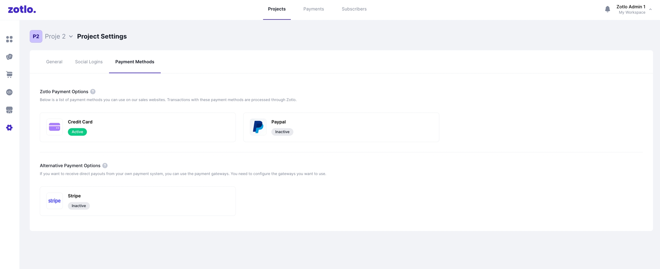 "Projeler" başlığı altında yer alan "Ödeme Yöntemleri" sekmesinden ödeme ayarlarınızı yapılandırabilirsiniz.