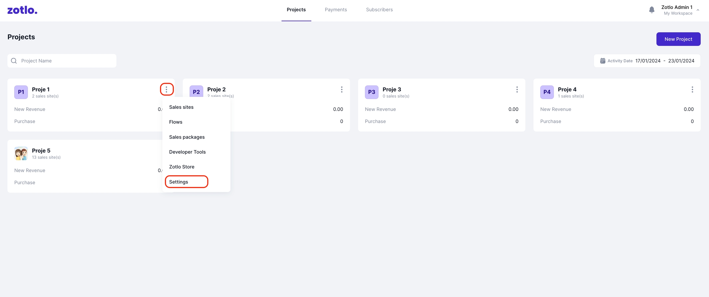 Zotlo’da projenizi oluşturduktan sonra, her bir proje kartının menüsünde yer alan "Ayarlar" başlığına tıklayarak proje ile ilgili ayarları yönetebilirsiniz.