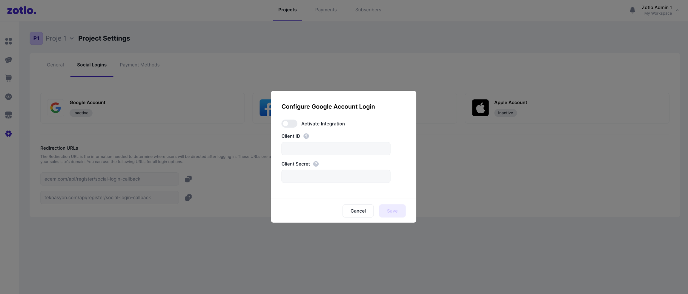 Eğer Google'ın sosyal giriş seçeneğini kullanarak Zotlo ile entegrasyon yapıyorsanız, Client ID ve Client Secret bilgilerini entegrasyon paneline girmeniz ve Redirect URL bilgisini de Google Developer Console'a girmeniz gerekmektedir.