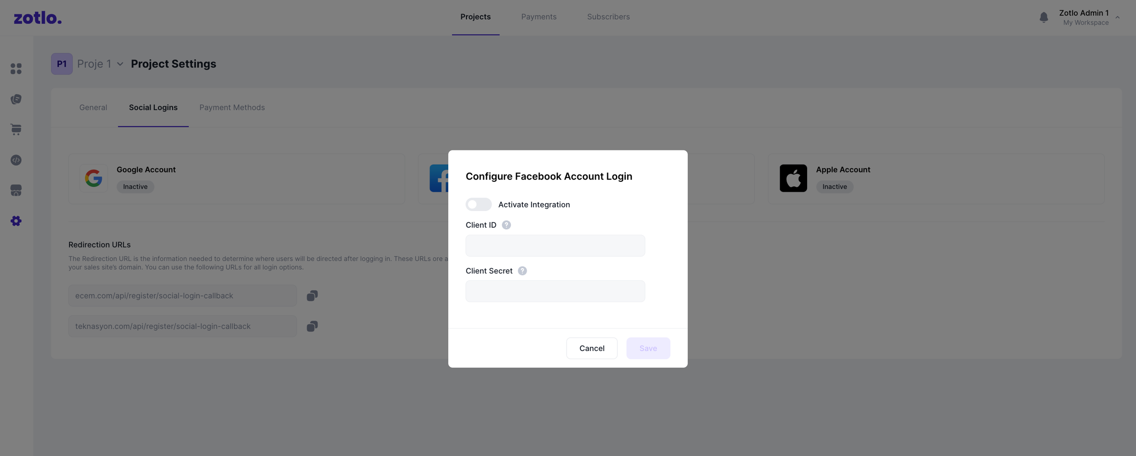Eğer Facebook sosyal giriş seçeneğini kullanarak Zotlo ile entegrasyon yapıyorsanız, Client ID ve Client Secret bilgilerini entegrasyon paneline girmeniz ve Redirect URL bilgisini de Facebook Developer Console'a girmeniz gerekmektedir.