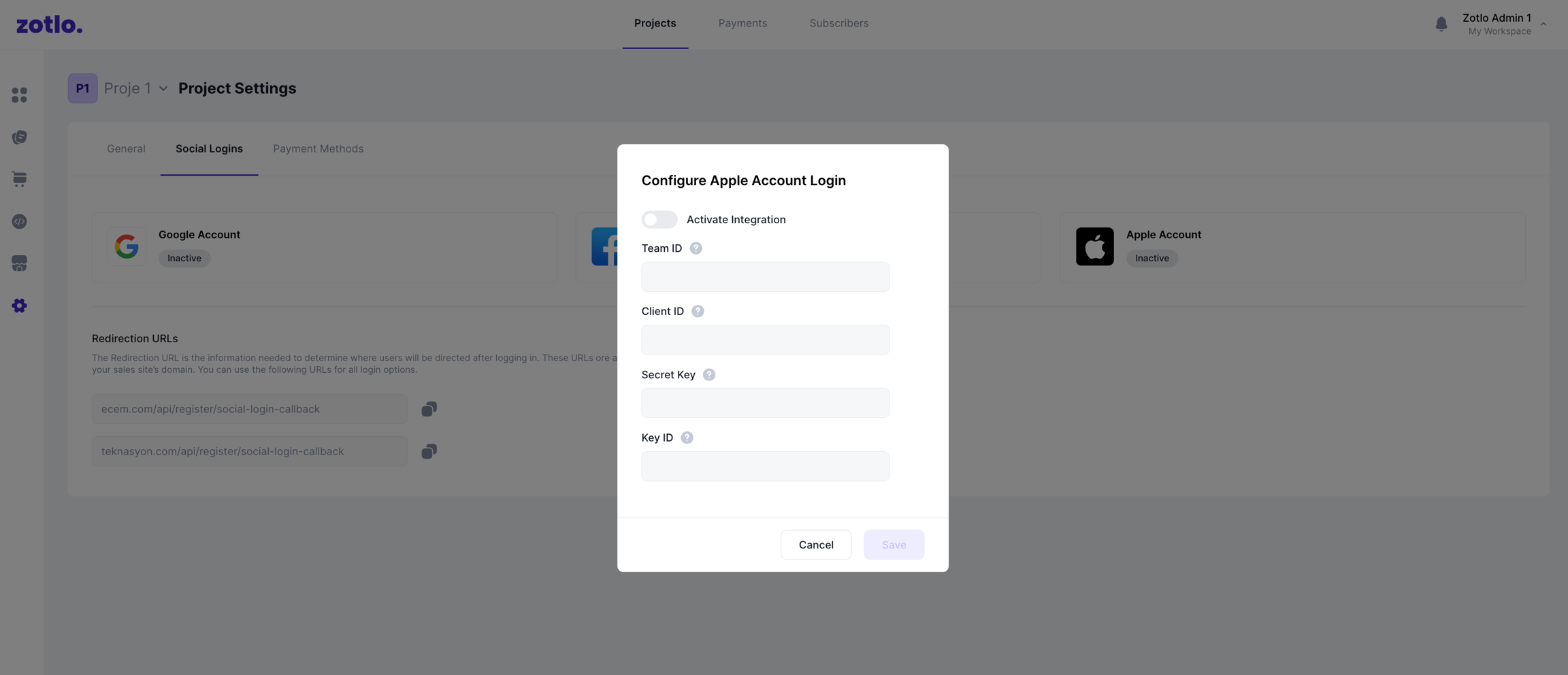 Eğer Apple'ın sosyal giriş seçeneğini kullanarak Zotlo ile entegrasyon yapıyorsanız, Apple Developer hesabınızdan Team Id, Client Id, Secret Key ve Key Id bilgilerini almanız gerekmektedir.Bu bilgileri doğru bir şekilde Zotlo panelindeki entegrasyon ekranına girdikten sonra entegrasyon işleminiz tamamlanacak ve kullanıcılar Apple kimlik bilgileriyle kayıt işlemi yapabileceklerdir.