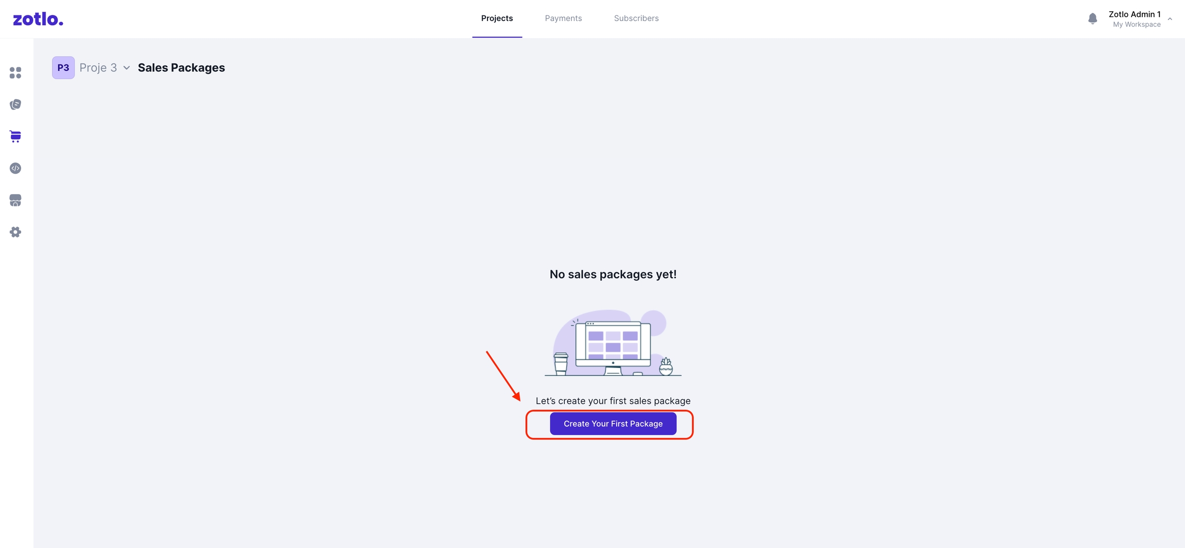 Satış paketlerini oluşturmak için, proje içerisindeki yan menüden “Sales Packages” sayfasına girip “Create Package” butonuna tıklanmalıdır.